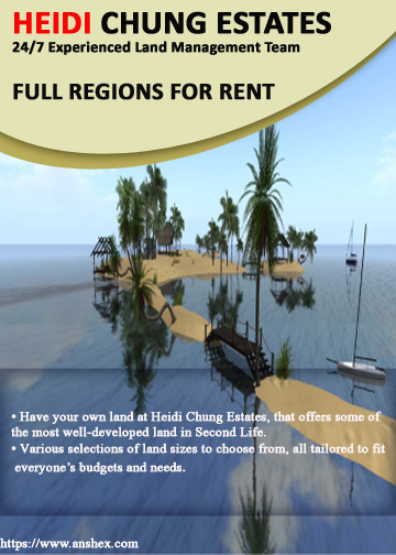 Newest estate available in Second Life by Anshe Chung. It was established in 2014, real-time sim performance monitoring with fun community activities. Free access to all items of the Anshe Chung Content Library and full access to our community facilities. Willing to serve you 24/7 live support. Contact Heidi Chung