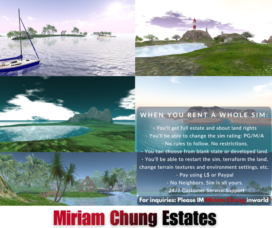 The Miriam Chung estate's history dates back to Second Life's first and most successful estate Dreamland, est. 2004. Today you can find many different types of residential, commercial and unzoned land parcels in this sim and whole sim rentals. As in all Anshe Chung Sims estates you receive 24/7 live support, free access to all items of the Anshe Chung Content Library and full access to our community facilities.